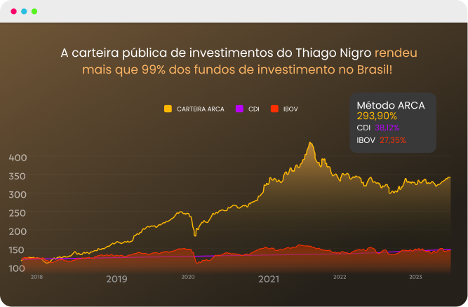 O método ARCA é um modelo de alocação ensinado pelo Thiago Nigro, o Primo Rico, que permite ter ganhos significativos em seus investimentos, ao mesmo tempo que diminui as perdas nos momentos de stress. Testado e validado em + de 7 países.